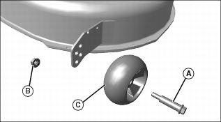 • Retirer la vis à épaulement (A) et l'écrou (B). Placer la roulette (C) dans le trou de montage correct. La fixer avec une vis à épaulement et un écrou. Serrer l’écrou à 34 N.m (25 lb-ft).