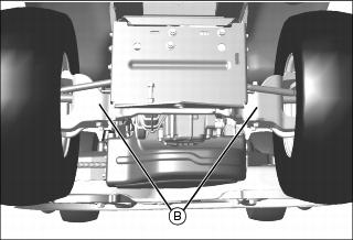 8. Arrimer l'arrière de la machine des deux côtés de l'essieu aux points (B) à la remorque avec des sangles, des chaînes ou des câbles robustes. Les sangles doivent toutes être dirigées vers le bas et vers l'extérieur de la machine.