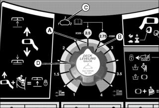 3. L'autocollant de molette de hauteur de coupe est situé sur la console de la machine. Cet autocollant illustre les positions d'assiette du carter de coupe (A et B) et l'emplacement des points de réglage d'assiette du carter de coupe (C). L'emplacement des points de réglage varie légèrement d'un carter à l'autre :