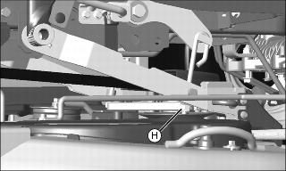 a. Utiliser la jauge (E) pour mesurer la hauteur entre le sol et le bord inférieur du carter de coupe au point de réglage 1 sur le bord arrière gauche du carter de coupe. Régler l'écrou de réglage arrière gauche (H) jusqu'à ce que la jauge puisse juste glisser sous le bord du carter de coupe au point de réglage 1.