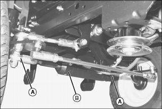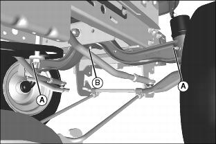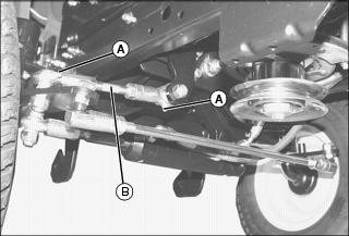 1. Lubricate two grease fittings (A) on front steering link (B) with one or two pumps of general all-purpose grease.