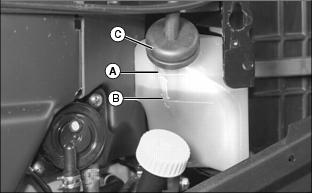 4. Remove cap (C) from recovery tank if coolant is low. Add ethylene glycol antifreeze (without stop-leak additive) and water in a 50/50 ratio to bring coolant up to proper level.