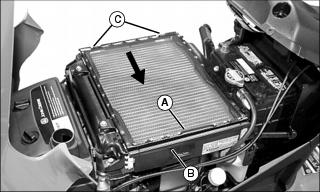 3. Lift left edge of radiator screen (A) on top of radiator (B), and slide screen to the left to disengage from two retaining tabs (C) on right side of radiator.