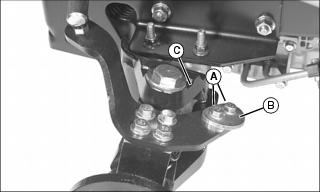 3. Flip steering stop to the “chain” position, with the larger lobe pointed toward the rear axle support casting (C), and secure with M8 hardware, removed earlier. Tighten hardware securely.