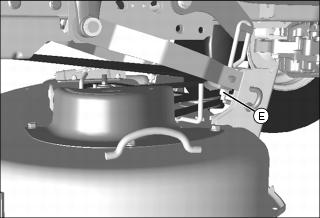 c. Adjust mower level, if necessary, by turning nuts (E) clockwise to raise the side of the mower deck, or counterclockwise to lower the mower deck.