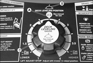4. Set mower cutting height knob (C) to deck leveling position 2.5 (A), and lower deck against stop.
