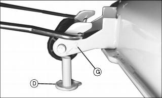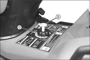 6. Remove the mower deck level gage (D) stored in the mower cutting height knob (C).