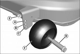 4. Remove shoulder bolt (D) and nut (E) and adjust mower wheels to desired height as follows: