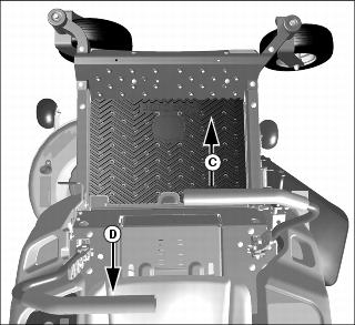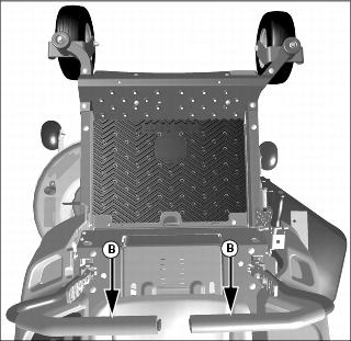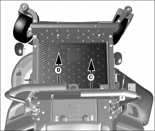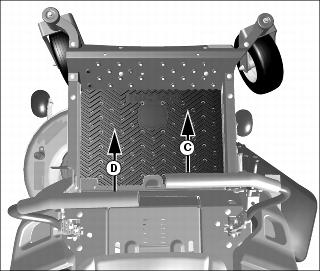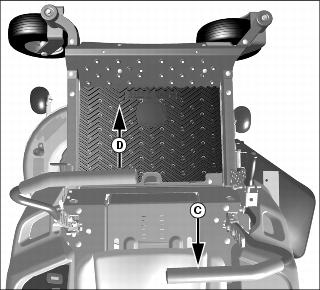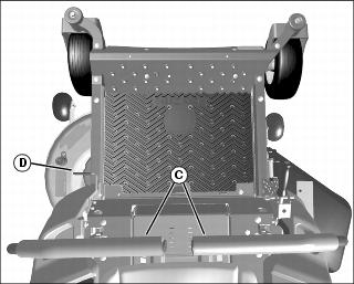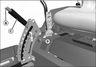 4. To lower mower deck, push in button (B) and lower mower deck lift lever (C) onto pin (D).