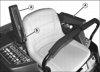 2. Turn adjustment knob (B) clockwise to lower armrest and counterclockwise to raise armrest. Lower armrests.