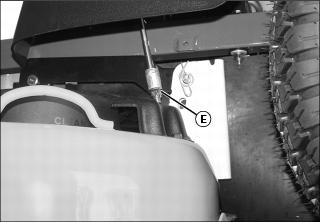 c. Adjust mower level, if necessary, by turning rear nuts (E) clockwise to raise the side of the mower deck, or counterclockwise to lower the mower deck.