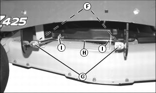 c. Adjust mower level, if necessary, by loosening rear nuts (F) on front lift rod. Turn front nuts (G) clockwise to raise front of mower or counterclockwise to lower it. Make sure front lift rod (H) contacts mower deck bracket on both sides (I) to maximize stability of deck. Tighten rear nut after adjustment is complete.