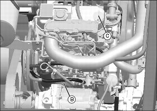 5. Loosen hose clamps (B), and disconnect radiator hoses (C).