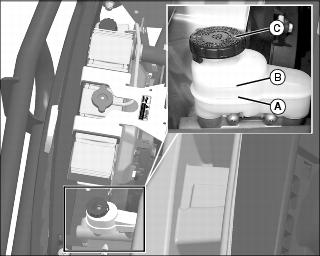 3. Visually check brake fluid reservoir. Brake fluid level must be between “MIN” (A) and “MAX” (B) marks. If fluid is low: