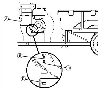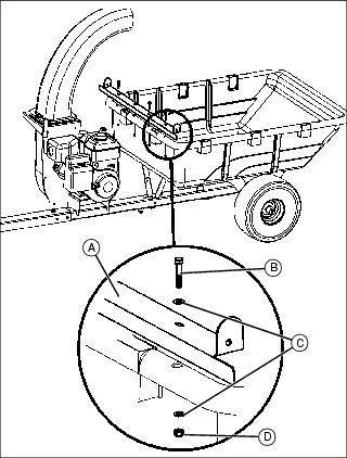 1. Install engine and blower assembly (A) on towbar using four 5/16x1-1/2 in. bolts (B), four 5/16 in. flat washers (C) and four 5/16 in. locknuts (D).