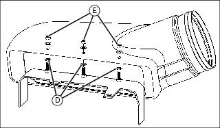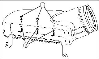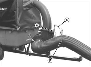 2. Install hose support rod (D) in socket (E) on blower housing.