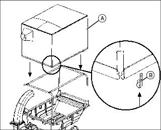1. Slide canopy (A) on the canopy tube frame and position canopy inlet on chute. Secure the sides and front of the canopy under the front and side brackets using four canopy clips (B) evenly across each side and three canopy clips across the front.