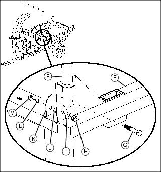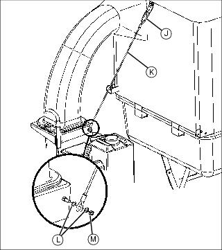 4. Install quick link (J) on quik link bracket. Install one end of cable (K) on quick link. Install the opposite end of cable on exposed bolt on chute bracket using two 1/4 in. flat washers (L) and one 1/4 in. locknut (M).