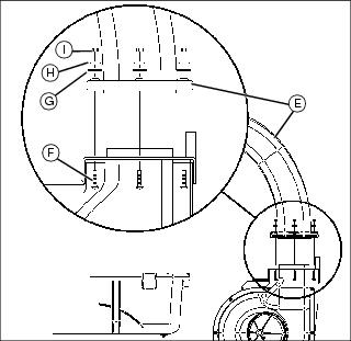 2. Install chute (E) on blower housing using one 1/4x1-1/2 in. carriage bolt (F), one 5/16 in. fender washer (G), one 1/4 in. flat washer (H) and one 1/4 in. locknut (I) in each of three locations.