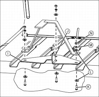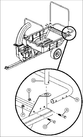 4. Position rear handle (N) on rear of bed, on inside of side brackets. Attach handle to rear flange of side brackets using one 5/16x1-1/2 in. bolt (O) and one 5/16 in. locknut (P) on each side.