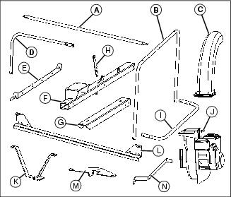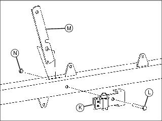 3. Position towbar switch bracket (K) with switch on towbar. Install a 3/8x3-1/2 bolt (L) through the switch bracket, towbar, bed release handle (M) and opposite side of towbar and secure with a 3/8 in. locknut (N).