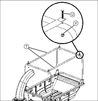 6. Position two top canopy tubes (T) on canopy end tubes and secure using four 1/4x1-1/2 in. carriage bolts (U) and four 1/4” locknuts (V).