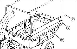 7. Install baffle (W) on left canopy frame using two 5/16x2 in. bolts (X) and two 5/16 in. locknuts (Y). Tighten hardware to allow baffle to rotate freely. Repeat to install second baffle on right canopy frame.