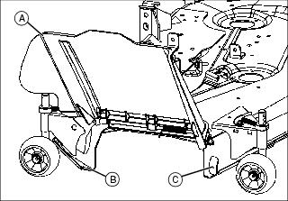 1. Place the engine, blower and chute assembly (A) on the towbar and position the chute in the canopy opening. Secure with the engine blower and chute assembly to the towbar with four 5/16x1-1/2 in. bolts (B), four 5/16 in. flat washers and four 5/16 in.locknuts (C).