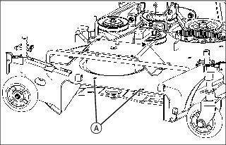 3. Install two 5/16x3/4 in. carriage bolts through the boot bracket and deck at location (A) and secure with two 5/16 in. locknuts.