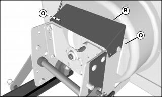 5. Loosen, do not remove, two nuts (Q) that retain belt guard bracket (R) to snowblower housing. Remove belt guard bracket, which is slotted for easy removal and installation.