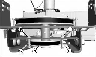 1. Remove two nuts (F) and belt guard bolts (G) at secondary drive sheave (H).