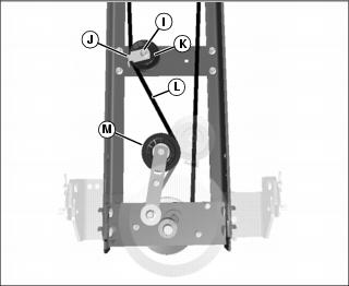2. Remove nut (I) and belt guard (J) from idler sheave (K).