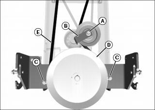 2. Remove two retaining nuts and belt guard bolts (C) at primary drive sheave (D).