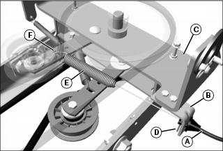 c. Hook end of cable spring (E) into slotted hole (F) in primary (upper) tensioning arm.