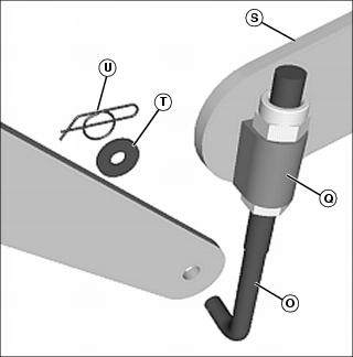 9. Install lower end of each lift rod (O) into mounting hole in lift arm and secure with M10x30 OD washer (T) and locking cotter pin (U).