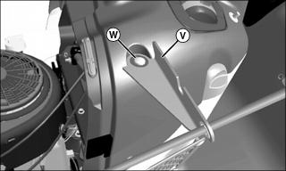 11. Position chute control bracket (V) on console and install M6x45 carriage bolt (W). Install M6 serrated lockwasher, M6.4 washer and M6 wingnut on carriage bolt from underneath hood. Tighten securely.