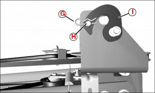 3. Remove spring locking pin (G) and drilled pin (H) that secures the latch (I) to the hanger bracket at both sides of the machine. Rotate the latch backwards to expose the slot in the hanger bracket.