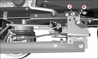 4. Lift the back of frame and align the slot (J) of the hanger bracket with the long bushing (K) at the rear mounting plate at each side of the machine.