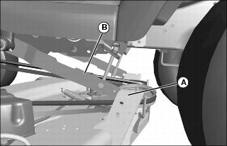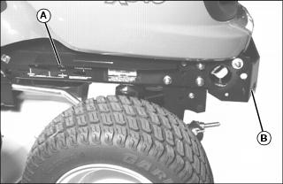 4. Slide mower deck under tractor and line up deck bracket (A) with draft arm (B).