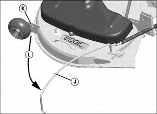 9. Grasp and hold tension rod (I) securely. Disengage rod from retaining bracket (J) by rotating rod counterclockwise. Move rod as far as possible toward rear wheel. Install separate drive belt (K) onto mower deck and engine sheave (L), and move tension rod back into retaining bracket.
