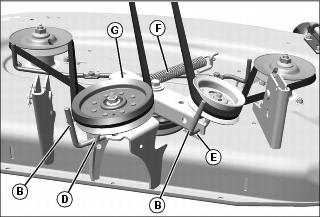 • To remove belt, rotate tension arm (E) slightly counterclockwise and remove secondary belt (F) from sheaves.