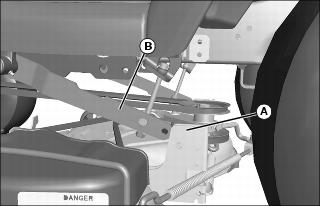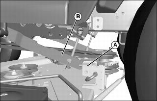 9. Pivot drive belt tension rod (A) toward front of machine to tighten drive belt. Hook tension rod into bracket on mower.