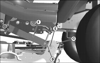 6. Remove locking clip (D) and pin (E), and move rear draft arm (F) away from deck bracket (G). Raise deck slightly with deck handle to remove pressure on pin when pulling out. Repeat on other side.