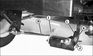 • Remove locking clip (J) from stud (K) on each side, and remove front draft rod from draft bracket (L). Note orientation of stud offset when removing, correct offset is above rod.