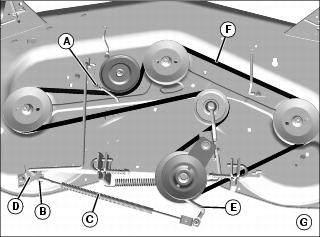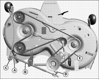 10. Install belt on mower deck as shown. Make sure belt is under tension rod (C), and in the groove of each sheave. If necessary, rotate tension arm (E) slightly to place belt onto the last sheave.