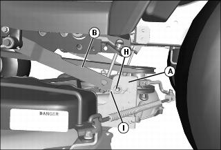 8. Install pin (H) through deck bracket (A) and draft arm (B). Make sure pin installs completely through deck bracket. Secure pin with locking clip (I). Repeat for other side.