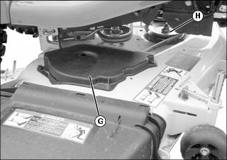 c. Top of mower deck, under shields (G), including spindle (H) and belt areas.