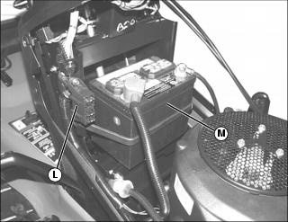 e. On right side near fuse block (L), and all wiring, including the battery (M) and related wiring harnesses.