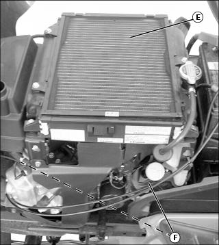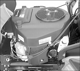 b. Engine intake screen (D) or radiator (E), and cooling fins (F).