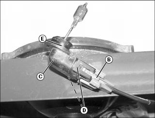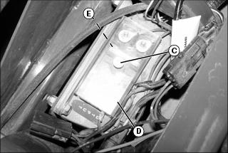 6. Retirer la vis papillon (C) et le couvercle (D), puis repérer le fusible (E) sur le faisceau de câblage.